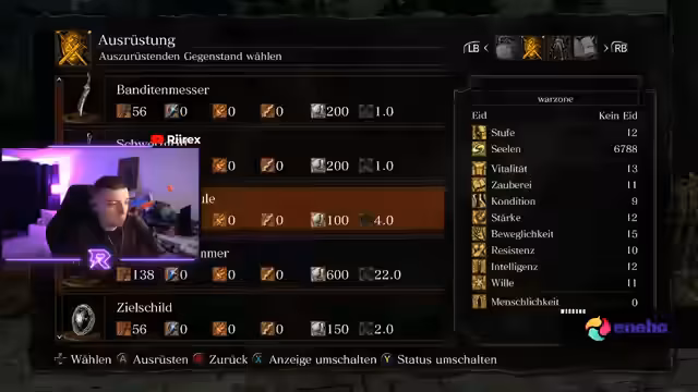 00:48:28Nachdem er erfolgreich den ersten Boss besiegt hat und sich durch das Töten weiterer Feinde eine enorme Seelenreserve aufgebaut hat, widmet er sich der Vorbereitung für den eigentlichen Godrun. Die Seelen werden benötigt, um wichtige Attribute wie die Adaptierlichkeit (ADP) für bessere Ausweichbewegungen zu leveln. Gleichzeitig geht er auf den Anstieg seiner Viewerzahlen ein und erwähnt, dass er damit die Kriterien für Twitch-Partnerschaften erfüllt hat und auf die offizielle Bestätigung wartet.