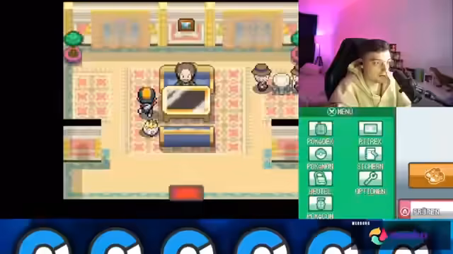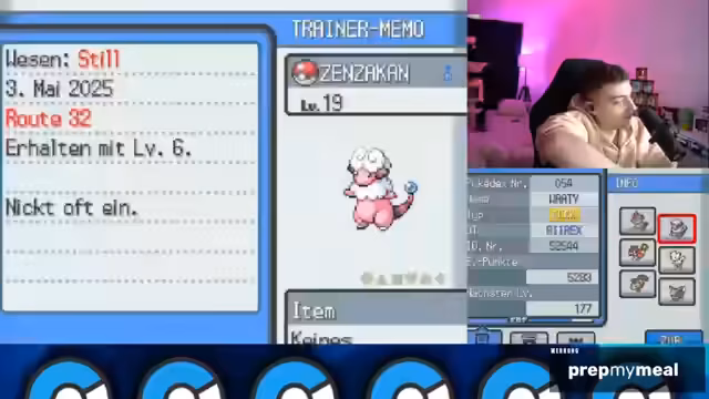 00:37:25Matz ist weiterhin dabei, sein Team mit wilden Pokémon aufzubauen und diese zu leveln. Er fragt den Chat nach Tipps zur Entwicklung von Kanimani und anderen Pokémon und zeigt seine fehlende Kenntnis der späteren Generationen. Nachdem er Level 10 erreicht hat, heilt er sein Team und erhält den ersten Orden. Anschließend folgt er der Story und begibt sich zu Mr. Pokémon. Dort wird er mit einem rätselhaften Ei konfrontiert, das Professor Lind untersuchen soll. Er erhält einen modernen Pokédex und telefoniert mit seiner Mutter, bevor er die Reise fortsetzt.