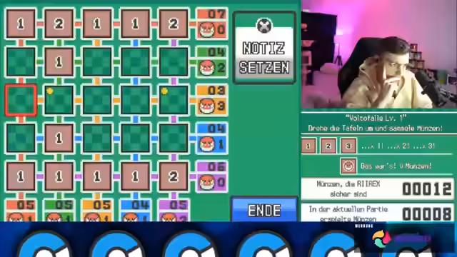 06:03:23Der Streamer stößt auf ein technisches Problem, als er das Voltorb-Spiel in einem Spielhalle beginnen möchte. Er ist frustriert, da er das gesamte Feld aufdecken möchte, ohne den Bolteball zu verwenden. Der Streamer versucht, die Logik des Spiels zu verstehen, indem er die Positionen der Münzen und Bomben analysiert. Er experimentiert mit verschiedenen Strategien, die jedoch oft vom Glück abhängen und ihn schnell zum Scheitern bringen. Seine anfängliche Enttäuschung weicht einer wachsenden Verwirrung, da er die Spielmechanik nicht zu durchdringen scheint und denkt, das Spiel sei vielleicht nichts für ihn.