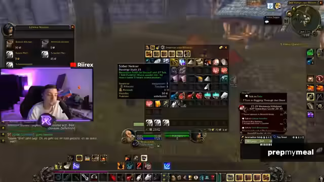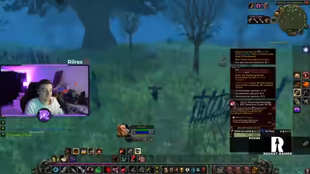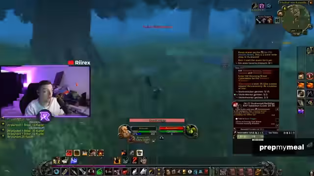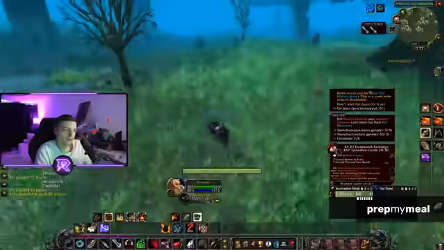 00:01:07Der Stream beginnt mit der Ankündigung, dass es nur noch 11 Tage dauern könnte, wieder Level 60 zu erreichen. Der Streamer ist unterwegs, um eine Kochungsquest anzunehmen, stellt jedoch fest, dass er den dafür benötigten Skill nicht besitzt. Beim Farmen von Erfahrungspunkten stirbt sein Haustier, was den Kampf erschwert. Auch eine kritische Situation mit einem frisch gespawnten Elite-Mob führt beinahe zum Tod, und der Streamer stellt fest, dass er ohne Dummies zum Skillen sehr verwundbar ist. Er betont, dass er sehr viel EP-Überfluss habe und der fehlende Koch-Skill kein Problem darstelle.