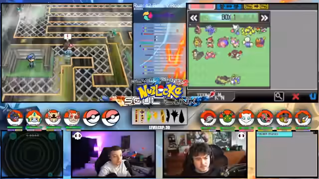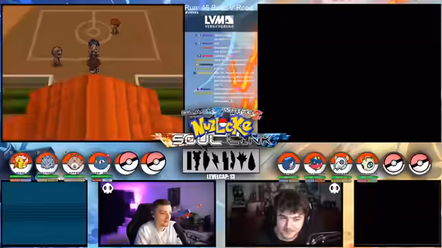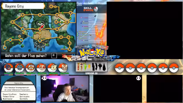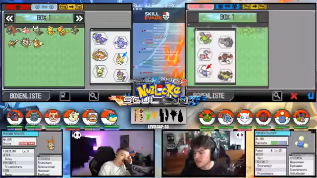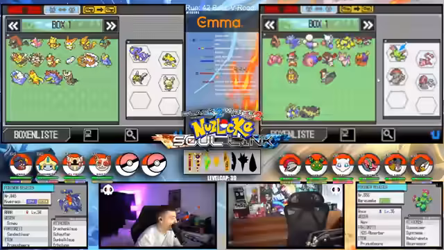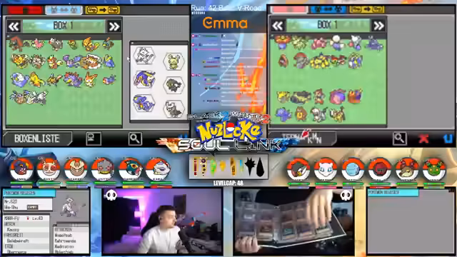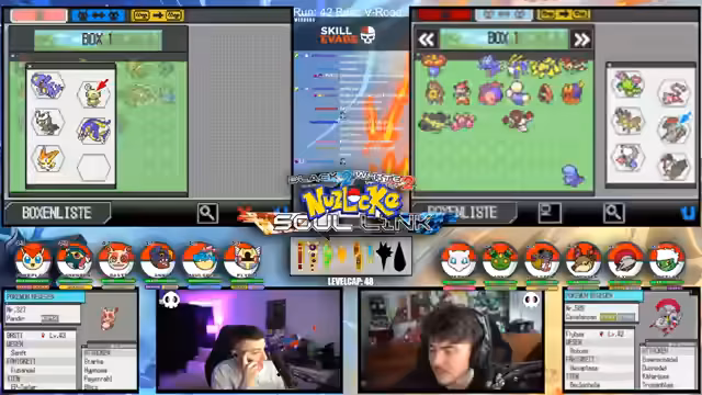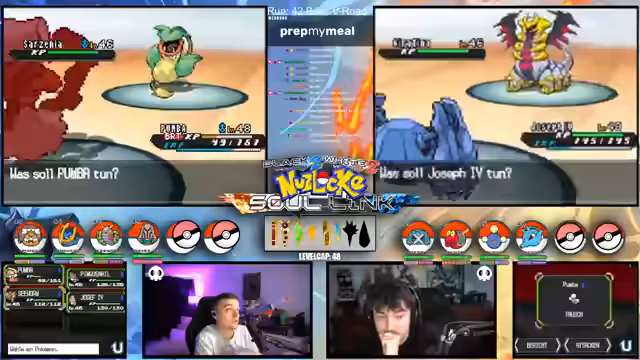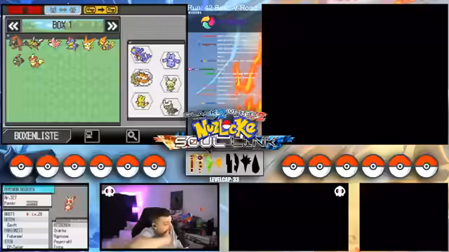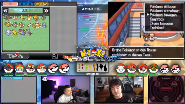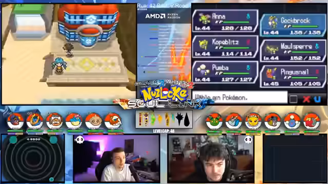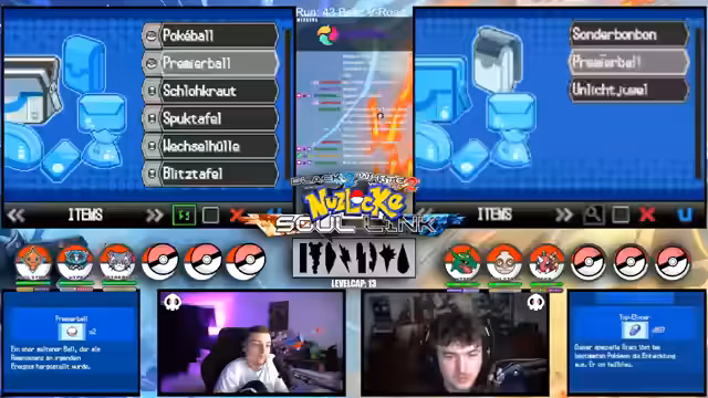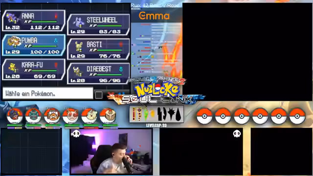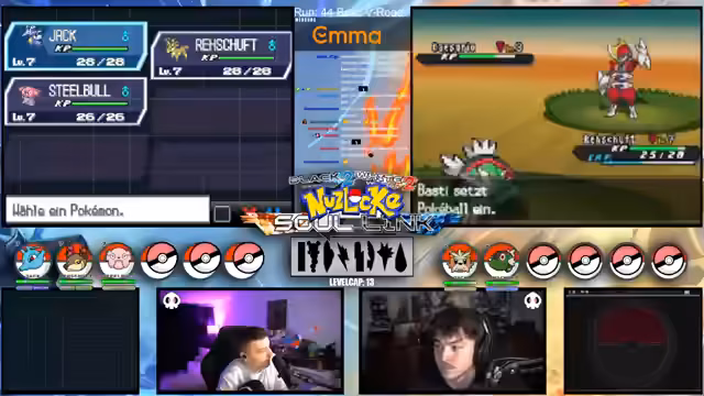09:09:49Zu Beginn des Streams werden die Rahmenbedingungen der Soullink Challenge vorgestellt, die mit den anderen Streamern @zepho, @krokoboss und @xthesolutiontv auf der Plattform Eneba gespielt wird. Die Streamer wechseln sich bei den Kämpfen ab, um gemeinsam durch das Spiel Pokémon Schwarz 2 zu kommen. Ein wiederkehrendes Problem ist das Auslaufen des Balls-Counters, was die drei-Ball-Regel gefährdet und den Fokus auf präzise Würfe lenkt. Die Teilnehmer bauen ein Team mit unterschiedlichen Pokémon-Typen auf, um später den Arenachallenge besser bestehen zu können.