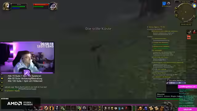 06:16:28Als Abwechslung wechselt der Stream zu World of Warcraft, speziell einem Hardcore-Server. Der Einstieg ist geprägt von Überforderung, da er das Spiel noch nie gespielt hat. Er erkundet die grundlegende Bedienung, die Menüführung und sucht nach Hilfe bei Add-ons wie Questie. Das Ziel ist es, einen Hexenmeister auf Level 20 zu bringen, wobei er von der Komplexität des Spiels und der Notwendigkeit, Ressourcen zu managen, zunächst überwältigt ist.