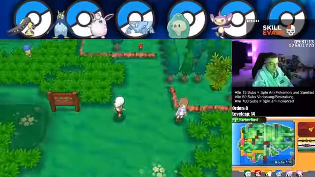 02:08:52Nach dem erfolgreichen Kampf erreicht das Team einen neuen Level-Cap von Level 16 und erkämpft sich den ersten Erinnerreiter. Der Streamer erkundet die Spielwelt weiter, sammelt Items und sucht nach neuen Pokémon-Encounters. Dabei wird eine neue Route betreten und ein Item namens Devon Waren gefunden. Anschließend werden die ersten beiden Räder, eins für ein Apex Legends-Spiel und eines für Pokémon, aktiviert, um Tauschaktionen oder Belohnungen für die Community zu ermöglichen.