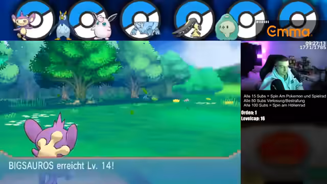 03:08:12Nach dem dramatischen Kampf wird ein Zuschauer namens Pete mit einem Sub von einem anderen Zuschauer namens Happy beschenkt. Der Streamer baut eine Lore um ein Pokémon namens Herzschlag auf und erklärt, es müsse das Team ausgetauscht werden, um eine glaubwürdige Geschichte zu erschaffen. Mit Unterstützung der Community wird schließlich ein Erinnerreiter gewonnen, was als Zeichen des gemeinsamen Erfolgs gefeiert wird.