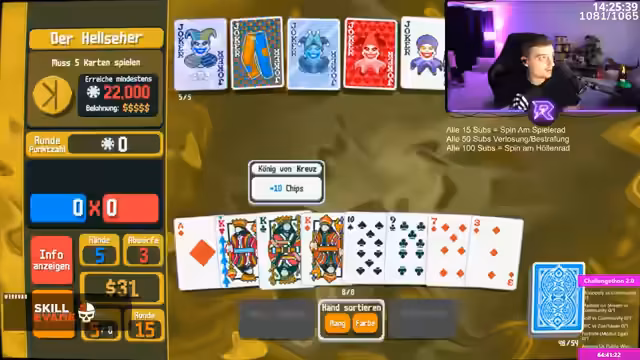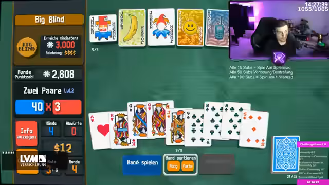 05:18:08Der Stream widmet sich einem Poker-basierten Spiel, bei dem verschiedene Kartenkombinationen wie Vierlinge, Full Houses, Flushes und Straights Punkte und Multiplikatoren bringen. Der Fokus liegt auf der Strategie, welche Hände zu spielen sind, insbesondere das Verhältnis zwischen häufigen Low-Karten und selteneren High-Karten, um Multiplikatoren zu maximieren und Chips zu erhalten. Entscheidungen werden überwiegend basierend auf den获得的 Multiplikatoren getroffen, z.B. zwei Paare für Chips und Drilling oder Full House für höhere Multiplikation.