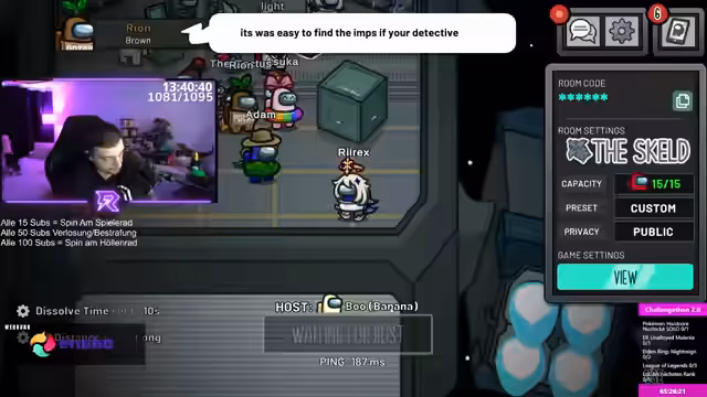 06:21:10Nach dem Poker-Spiel wechselt der Stream zu Rocket League. Der Streamer klagt über das erzwungene Tutorial, spielt aber dennoch und gewinnt ein Match. Anschließend wechselt er zu Among Us. Dort erlebt er aufgrund von hohem Ping und schlechter Kommunikation in den Public-Lobbys frustrierende Runden. Trotzdem gelingt ihm ein Sieg als Crewmate.