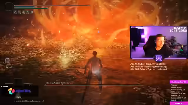 01:45:39Matzi wechselt das Spiel und startet Eldenring. Sein erstes Ziel ist es, einen zufälligen Boss und danach Malenia, Blade of Miquella, ohne Treffer zu besiegen. Nach einem kurzen Kampf mit einem anderen Boss beginnt der Kampf gegen Malenia. Er verliert jedoch schnell den ersten Versuch, als er von einer ihrer Attacken getroffen wird und versucht, sein Leben zu heilen.