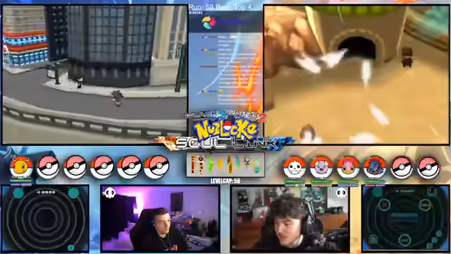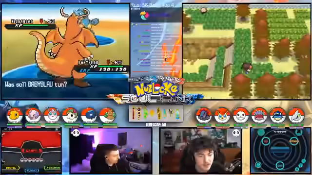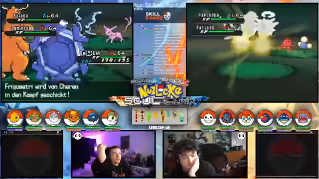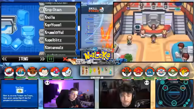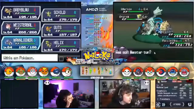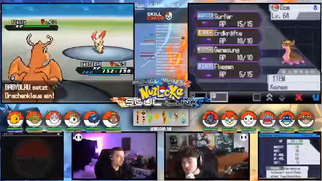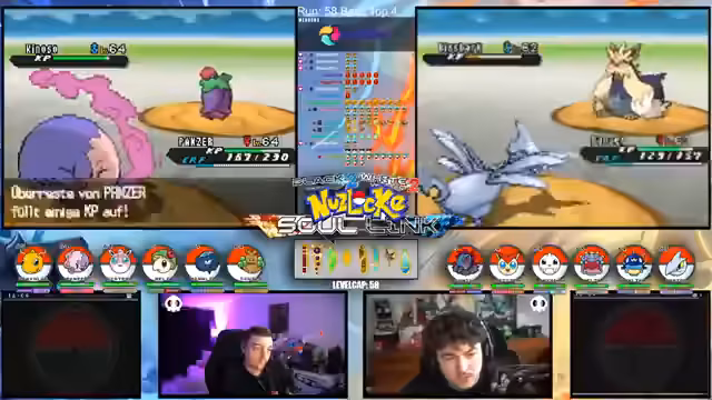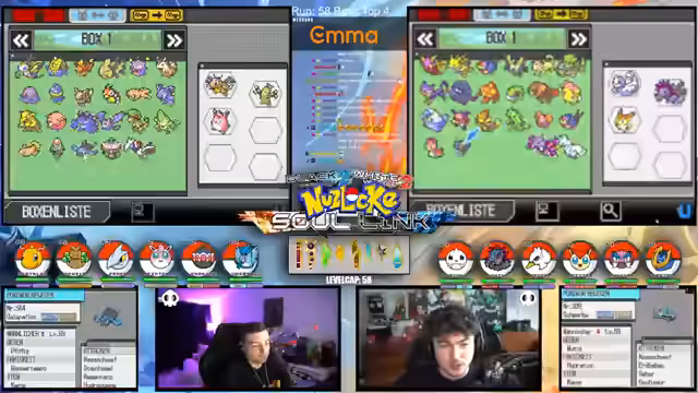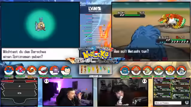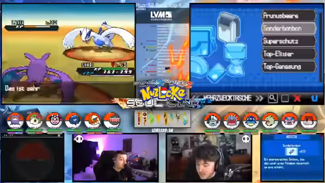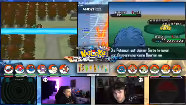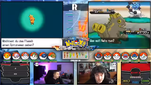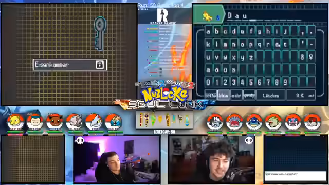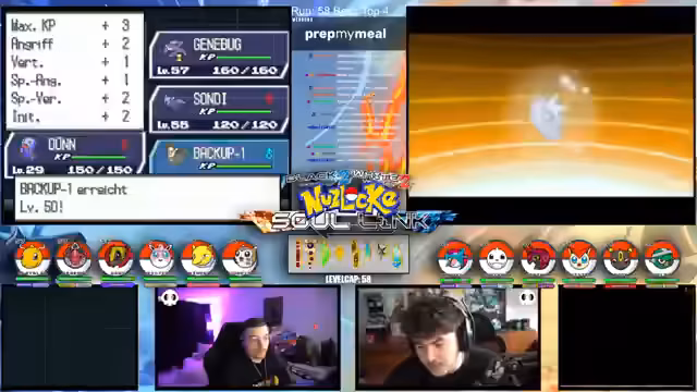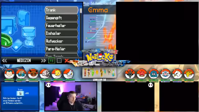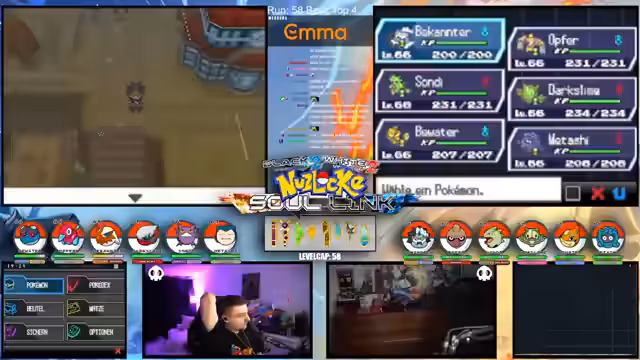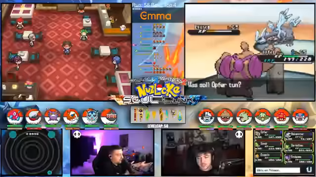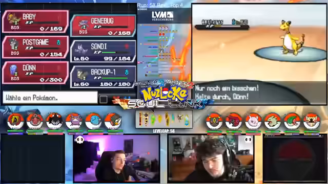 00:15:12Der Streamer gibt einen allgemeinen Überblick über den Fortschritt der laufenden Soullink-Challenge in Pokémon Schwarz 2. Es wird erklärt, dass die erste Top 4 bereits besiegt wurde, der Kampf aber erst zur Hälfte beendet ist. Die anstehende zweite Top 4 stellt eine signifikant größere Herausforderung dar, da alle Trainer sechs Pokémon im Team haben und diese auf einem viel höheren Level stehen. Der Verlust starker Pokémon wie Palkia und Papunga wird als Rückschlag für das Team benannt, wodurch der weitere Verlauf der Challenge als extrem schwierig und unsicher eingestuft wird.