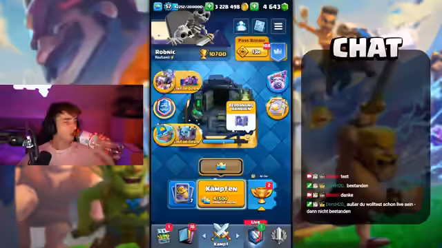 00:00:00Der Stream beginnt mit der Vorbereitung auf die vermutete Startzeit der neuen Fortnite Season um 21:30 Uhr. Der Streamer nutzt die Wartezeit, um ein ranked Clash Royale-Spiel zu spielen und zu kommunizieren. Dabei werden technische Schwierigkeiten deutlich: sowohl der PC als auch der Epic Games Launcher sind instabil und starten nicht zuverlässig. Der Streamer äußert seine Sorge, dass eine lange Warteschlange oder ein kompletter Absturz den Start in Fortnite verzögern könnte, und zitiert Chat-Angaben von Millionen gleichzeitig versuchter Logins.