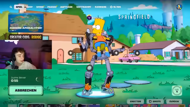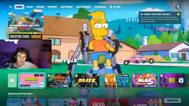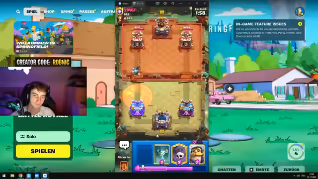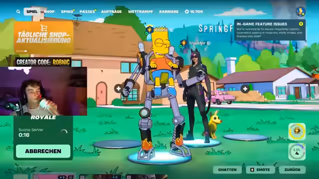 00:51:25Nachdem die Clash Royale-Runde erfolgreich beendet wurde, versucht der Streamer, sich in Fortnite einzuloggen. Er bewirbt seinen Creator Code 'Robnic' und weist darauf hin, dass Epic Games zum Start der neuen Season die Einnahmen für Content Creator verdreifacht. Der Plan ist, zunächst eine Solo-Runde zu spielen und dann mit 'Trials' im Duo Ranked einzusteigen. Jedoch kommt es zu Login-Problemen und Fehlermeldungen, die auf überlastete Server hindeuten. Der Streamer muss den Epic Games Launcher und Fortnite mehrmals neu starten. Er spekuliert über die hohe Anzahl an Spielern, die gleichzeitig versuchen, sich einzuloggen. Nach einigen Minuten und weiteren Versuchen gelingt es ihm schließlich, ins Spiel zu kommen. Er ist überrascht, dass das Titelbild noch die alten Fortnite Mares zeigt und nicht die neue Simpsons Season. Er überprüft den Battle Pass, stellt fest, dass er ihn bereits besitzt und freut sich auf den Homer-Skin. Als Creator hat er bereits Zugriff auf einen speziellen Skin, mit dem er in die erste Runde gehen möchte, obwohl einige Zuschauer von Matchmaking-Problemen berichten. Er passt seinen Begleiter, einen Bananenhund, an und startet schließlich erfolgreich in eine Runde.
