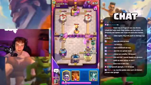 00:28:29Nach mehreren gewonnenen Clash Royale-Runden, die den Streamer auf fast 12.000 Trophäen bringen, äußert er die Hoffnung, dass die Fortnite-Server bald online sind. Er öffnet im Schnelldurchlauf verschiedene Kisten und Belohnungen in Clash Royale, darunter Banner, Emotes und Gold. Dabei stellt er fest, wie schwierig es ist, die Clan-Ziele zu erreichen, selbst mit einem halbwegs aktiven Clan. Er diskutiert über die Effektivität bestimmter Evolutionskarten wie die Evo-Skelette und teilt seine Präferenzen für Decks und Kartenlevel. Die Musik im Stream wird als entspannend empfunden, obwohl es anfangs einige Lieder gab, die ihm nicht gefielen. Die Spannung steigt, als die Zuschauer im Chat berichten, dass die Fortnite-Server online sind. Der Streamer bereitet sich darauf vor, in Fortnite zu wechseln, während er noch eine letzte Clash Royale-Runde spielt, um die verbleibenden Minuten bis zum Serverstart zu überbrücken.