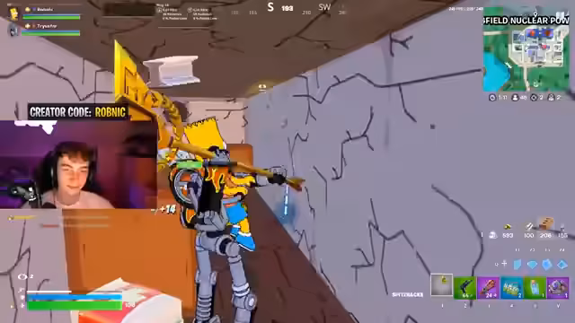 00:59:03Nach anhaltenden Problemen mit dem Launcher und langen Warteschlangen schafft es der Streamer endlich, ein Fortnite-Spiel zu starten. Er stellt fest, dass er sich bereits in der neuen Simpsons-Season befindet und die Titelgrafiken eventuell noch nicht vollständig geladen sind. Er präsentiert seinen Battle Pass, der bereits Stufe 1 erreicht ist, und zeigt den Hund als Start-Begleiter. Er entscheidet sich dafür, einen exklusiven Creator-Skin zu verwenden, den noch andere Spieler nicht besitzen können, und findet langsam ein Spiel für den Ranked-Modus.