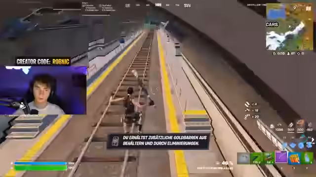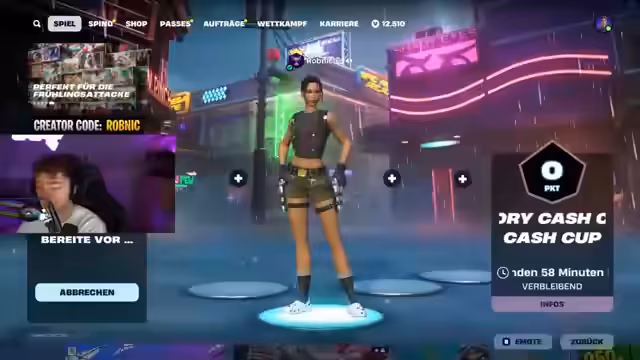 02:29:14Zu Beginn des Streams wird der anstehende Skin im Item angekündigt, der um 1 Uhr nachts verfügbar sein wird. Robnik hat das Ziel, beide Skins zu erhalten und bittet den Chat, seinen Creator Code für den Support einzutragen. Unmittelbar danach startet das eigentliche Spiel, wobei er die anfänglichen Placements absolviert und bereits nach kurzer Zeit eine erfolglose Runde mit einem Platz von 54 absolviert.
