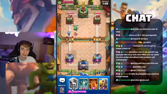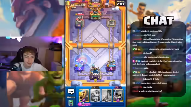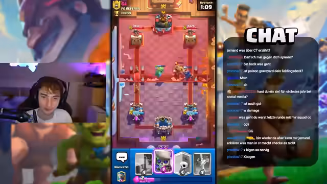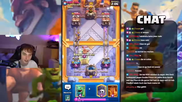 04:20:00Nach dem Wechsel zu Clash Royale spielte der Streamer entspannt weiter, nachdem er kurz ein Update laden musste. Er äußerte sich überrascht, wie lange er Fortnite im Solo-Modus gespielt hatte, da dies normalerweise nicht sein bevorzugter Modus ist. Im Clash Royale-Gameplay zeigte er sich zuversichtlich, da er mit seinen Level-16-Karten gegen Gegner mit Level 13 und 14 einen deutlichen Vorteil hatte. Er präsentierte sein aktuelles Deck, das er als etwas „random“ bezeichnete, aber betonte, dass es funktioniere. Er spielte fast ausschließlich mit dem Graveyard-Deck, da er keine anderen Karten entsprechend gelevelt hatte und auch keine passenden Evolutionen für andere Decks besaß, da er das Spiel größtenteils Free-to-Play spielte. Trotz einiger Verluste gegen bestimmte Decks wie Lumber-Loon, zeigte er sich insgesamt zufrieden mit seinem Deck und seinen Erfolgen.