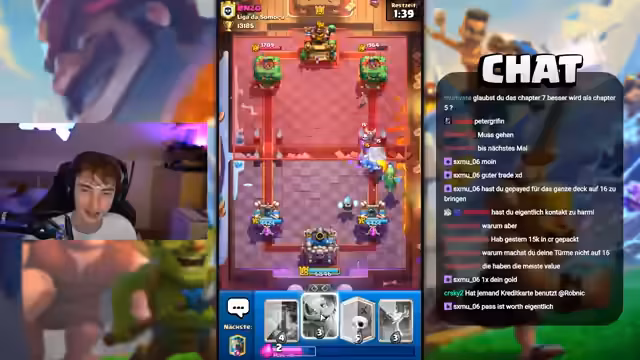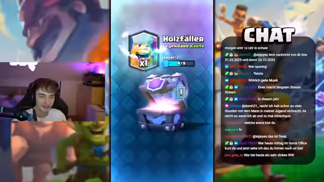 05:45:04Der Streamer begann ein großes Kisten-Opening, das von 10.000 bis 15.000 Trophäen reichte. Er äußerte sich enttäuscht über die Qualität der Drops, da viele Kisten nur geringe Mengen Gold oder unwichtige Karten enthielten. Trotzdem freute er sich über einige nützliche Karten und Kristalle, die für zukünftige Emotes verwendet werden können. Er erhielt den Mönch als Champion, den er als den coolsten unter den Champions empfand. Es wurde vorgeschlagen, die restlichen Pass-Kisten bis zum Ende der Season zu sammeln und dann ein XXL-Opening zu veranstalten. Der Streamer wechselte in den Ranglisten-Modus, wo alle Karten auf Level 15 gecappt sind, was das Flexen mit Level-16-Karten verhinderte.