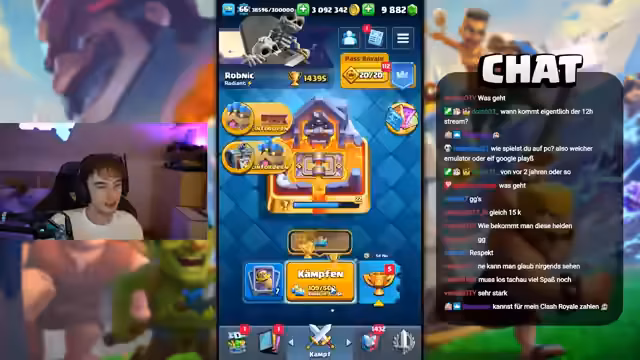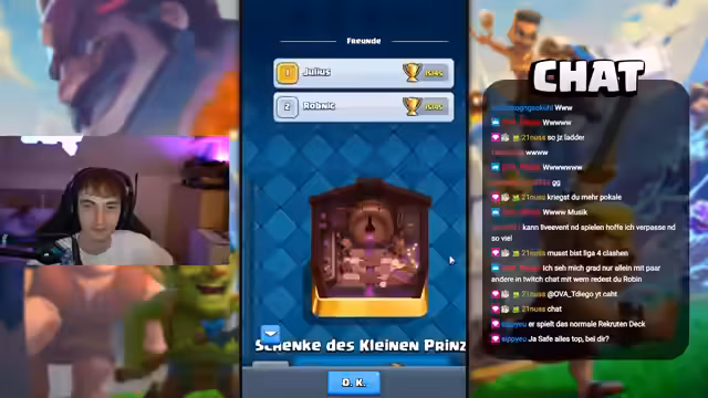 05:41:00Nach einer intensiven Spielrunde, in der der Gegner schließlich aufgab, erreichte der Streamer 15.000 Trophäen und stieg in eine neue Arena auf. Er zeigte sich sehr zufrieden mit diesem Erfolg und überlegte, ob er weitergrinden sollte. Es wurde festgestellt, dass ab 15.000 Trophäen nur noch +5 Punkte pro Sieg vergeben werden, was die Motivation für weiteres Grinden minderte. Die Frage, ob es sinnvoll ist, über 15.000 Trophäen hinaus zu spielen, wurde aufgeworfen, da die Belohnungen scheinbar begrenzt sind. Der Streamer begann daraufhin, die gesammelten Kisten aus der Trophy Road zu öffnen, die er seit 10.000 Trophäen nicht mehr geöffnet hatte.