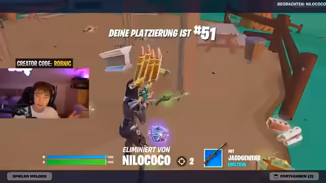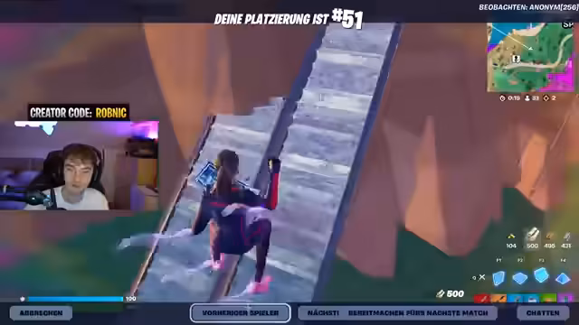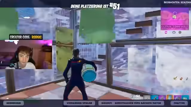01:39:27Der Streamer landet in einer Low-Gravity-Zone, die ihm nicht gefällt, und trifft auf einen Camper, der sich auf einem Ring versteckt. Er versucht, den Gegner zu finden, aber dieser verschwindet. Er entscheidet sich, einen anderen Gegner anzugreifen, obwohl er nicht sicher ist, ob es klug ist. Er kämpft in einer Kanalisation und äußert seinen Frust über die vielen Camper in seinen Runden. Er bemerkt, dass eine Sniper im normalen Battle Royale eingeführt wurde, aber nur in Casual-Matches verfügbar ist. Er kommentiert die neuen Modifikatoren in Reload Publics als 'Wahnsinn' und hofft auf mehr Content zum Season-Ende. Er findet die Simpsons-Season cool, ist aber auch bereit für das Ende, da sie sich mittlerweile zieht.