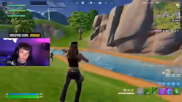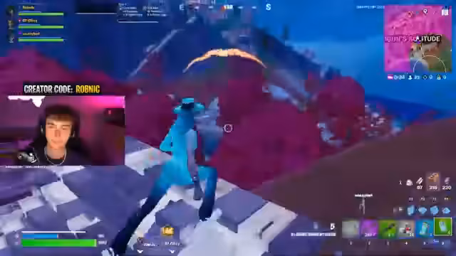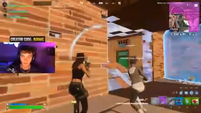 01:23:46Das Team wird von einem Gegner in der Nähe von Crime City angegriffen. Eine hektische Phase beginnt, in der der Streamer versucht, sich mit seinem Team zu koordinieren und den Angriff von oben aus zu beantworten. Ein Gegner unter ihnen wird gesichtet und eliminiert. Das gegnerische Team reagiert aggressiv und schießt zurück, was den Streamer dazu veranlasst, seine Position zu ändern und das Team in Richtung sichererer Zone zu bewegen, während er gleichzeitig die Rotation plant und den Loot priorisiert.