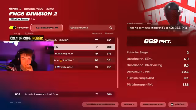 00:02:47Der Stream beginnt mit technischen Hinweisen zu einem verzögerten Stream, um das Turnier nicht zu stören. Der Fokus liegt klar auf dem wichtigen FNCS Division Cup, für den die Qualifikation für Division 1 das primäre Ziel ist. Nach dem ersten Tag steht das Team auf dem 20. Platz mit 379 Punkten, was bedeutet, dass ungefähr 300 Punkte am zweiten Tag benötigt werden, um sich für das Finale zu qualifizieren und die Teilnahme an der FNCS zu sichern.