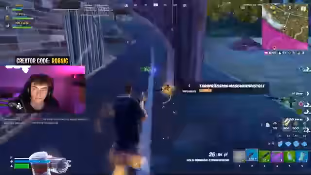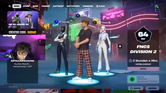 00:14:54Das Team ist nun komplett und der Streamer startet in den FNCS Division 2 Cup. Der Streamer fordert die Zuschauer auf, im Item-Shop den Creator Code 'ropeling' einzutragen, um den Stream zu unterstützen. das Team beginnt die Runde mit der Strategie, in Crime City nach Beute zu suchen und in der Stadt zu kämpfen, wobei die Erwartungen an einen guten Platz realistisch bleiben.