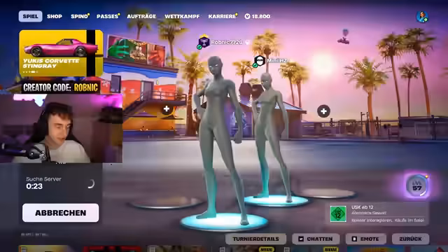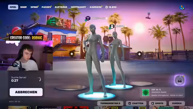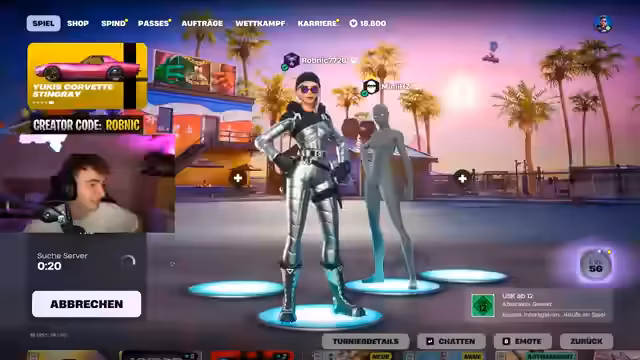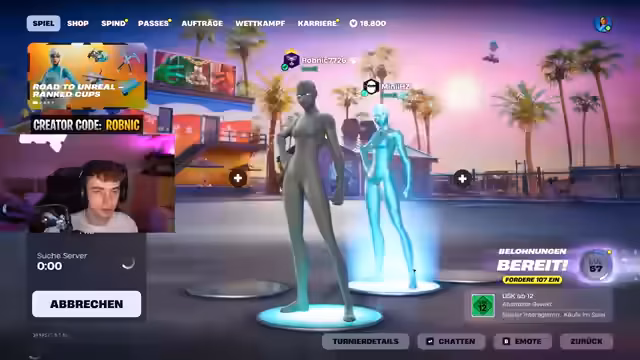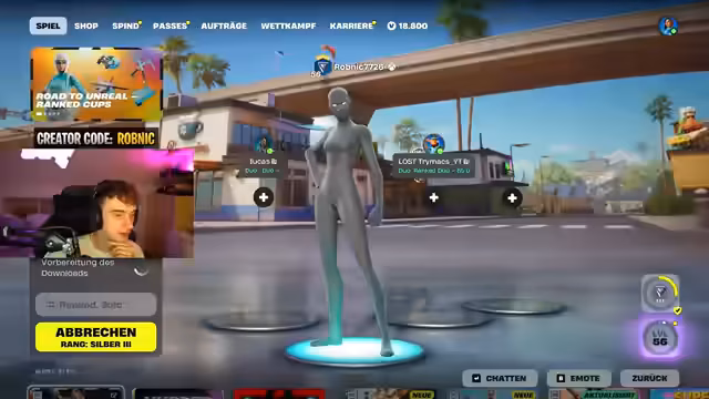 01:55:09Der Streamer bereitet den Download des Reload-Modus vor und ärgert sich über die lange Ladezeit. Er stellt Fragen zum benötigten Rang für No-Build-Cups (Reichsbattle Royale) und stellt fest, dass sein Wettkampf-Tab verbuggt ist. Nach Problemen mit dem下载 des Reload-Modus startet der Noble Cup auf Konsole. Der Unreal Cup am Samstag wird erwähnt, wo er aktuell Elite ist und noch zwei Up-Ranks bis zum Wochenende benötigt.