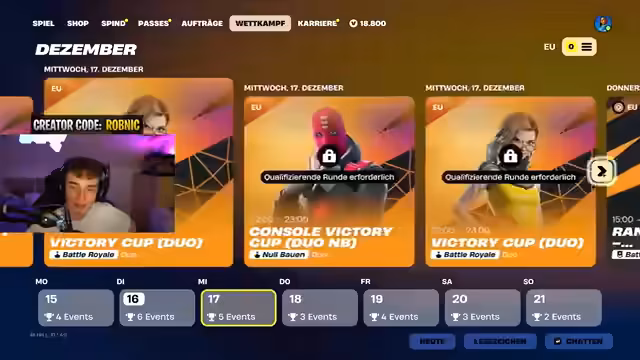 00:03:05Es wird erklärt, dass der Stream spät startete, weil der Streamer zuvor in einer Aufnahme war. Er erwähnt die aktuellen Earnings von 18.765 Dollar und das Ziel, 20.000 Dollar in dieser Season zu erreichen. Nach einer 5-minütigen Wartezeit ohne Spielstart diskutiert er die typische Winterpause in Fortnite, in der zwei Wochen lang keine Turniere stattfinden. Er stellt den Wochenplan vor: Montag Duo Victory Cup, Dienstag Reload Cup, Mittwoch und Donnerstag frei, Freitag Rank Cup, Samstag Console Cups und Sonntag ohne Turniere. Er bemerkt ungewöhnliche Cup-Strukturen in dieser Season.