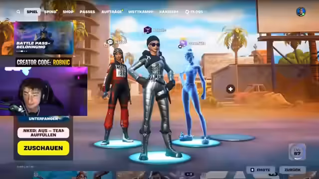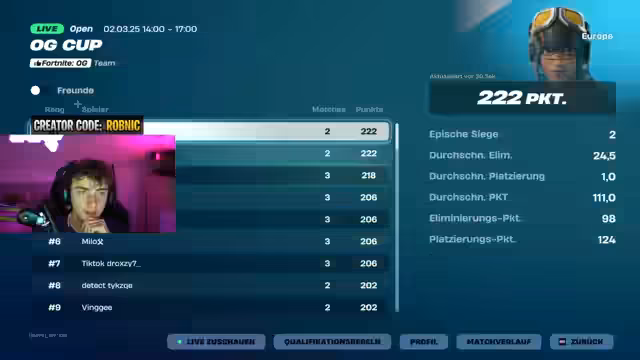 02:02:20Die Solo-Customs sind beendet mit fünf Kills für Hippo und elf Kills für M5. Der Streamer bedankt sich für die Teilnahme und announces Giveaway-Aktionen für zukünftige Streams. Er bietet Skin-Pakete und Schuhe als Preise an und bittet die Zuschauer, den Creator Code 'Robnic' zu verwenden, um mehr solche Veranstaltungen zu ermöglichen. Gleichzeitig startet der OG Squad Cup, in den der Streamer mit anderen Spielern einlädt.
