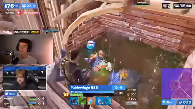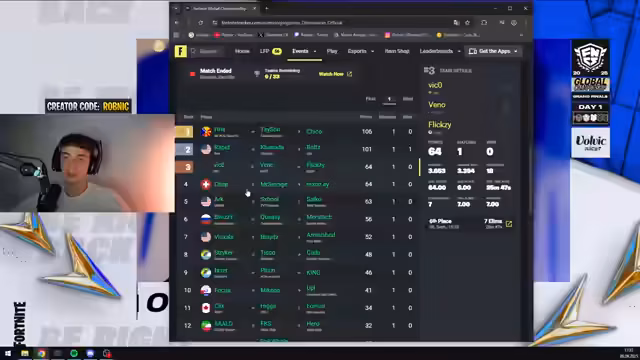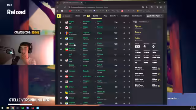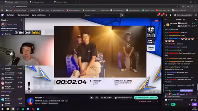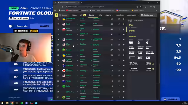 02:13:12Die Analyse geht zügig durch die Top-Teams, wobei Fridoxy in den Top 10 und Vico auf Platz 8 erwähnt werden. Deutsche Teams fallen zurück, während Baka und PXMP überraschen. Reason liegt auf Platz 12, nachdem sie eine Null-Punkte-Runde hatten. Peterbot und Poyo, die als Favoriten galten, liegen unerwartet weit unten auf den Plätzen 27 bzw. 24. Es wird betont, dass noch viele Runden ausstehen und sich das Ergebnis noch ändern kann. Das OCE-Team Alex belegt den letzten Platz mit null Punkten. Vico wird von einem Team auf Platz 32 contestet, was ihre Situation zusätzlich erschwert. Die Analyse schließt mit der Feststellung, dass Vico auf Platz 8 und Reason auf Platz 12 die interessantesten Teams für die Zuschauer sind. Während der Pause wird überlegt, Clash Royale zu spielen, um die Zeit zu überbrücken, aber man entscheidet sich dagegen, um den Fortnite-Vibe nicht zu stören. Es wird auf einen Timer für den Start der nächsten Runde hingewiesen und die Zuschauer werden aufgefordert, sich zu erfrischen und den Creator Code Robnik im Fortnite-Shop zu nutzen.