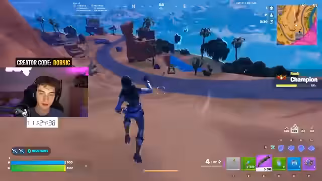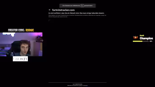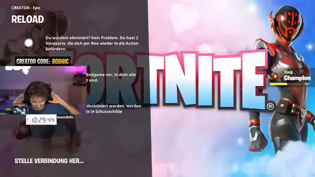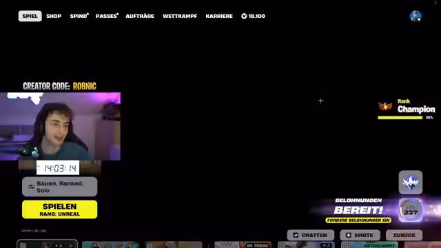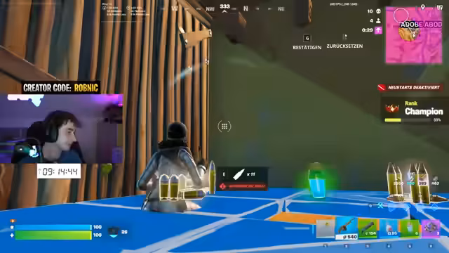 01:38:06Nach einer längeren Runde hat der Streamer den Champion-Rang erreicht und befindet sich bei 9 %. Er gibt an, nicht gestorben zu sein und geht als vollgeheilter 'Panzer' mit 300 HP in die nächste Runde. Er plant, seinen Grind bis zur Rangliste fortzusetzen und hofft, noch Top 100 zu erreichen. Sein Fokus liegt darauf, die Runden zu gewinnen, da dies den effizientesten Fortschritt im Ranking bringt. Er erwähnt die anstehenden Reload Cups und seine Absicht, mehr Turniere mit seinem Duo Rubix zu spielen, um die verpassten Aufstiegschancen nachzuholen.