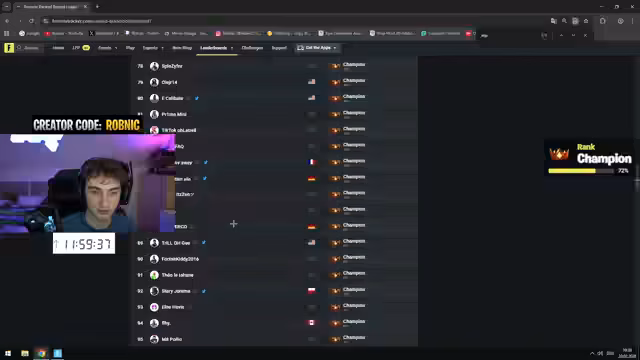 01:12:05Der Streamer ist nah an seinem Ziel und befindet sich auf Platz 72 im globalen Leaderboard. Sein Ziel ist es, unter die Top 100 zu kommen und den Rang 'Unreal' zu erreichen. Er erklärt, dass dies nach einem Rang-Reset besonders schwierig ist, da in den ersten Tagen viele Tryhards in den Lobbies sind. Er drückt seine gute Laune aus, obwohl der Rank-Grind anstrengend ist.