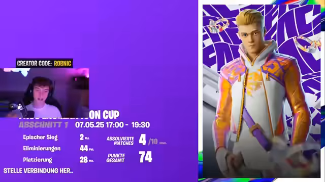 00:00:00Der Stream beginnt mit Landephase im Lockchain, wobei der Streamer aktiv kämpft. Nach einer kurzen Ankündigung zum FNCS Lachlan Skin Cup und der Aufforderung, den Creator Code Robnic im Shop zu nutzen, landet das Duo in der Zone. Sie kämpfen sich durch die erste Runde, eliminieren Gegner und looten konsequent. Am Ende der Runde haben sie Platz 70 mit 23 Kills und sammeln wertvolle Ressourcen wie Impulsegranaten und Waffen, was eine solide Grundlage für das Turnier darstellt.