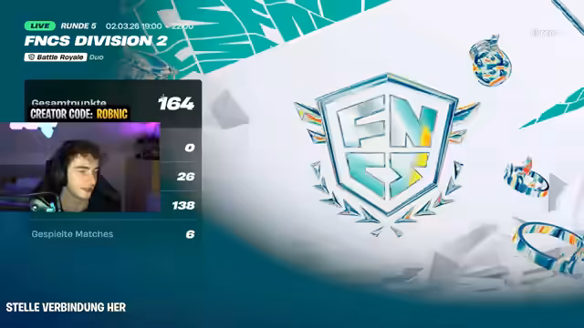 Bei einem FNCS Cup wurde mit einem Duo-Partnern um den Aufstieg in die höhere Division gekämpft. Nach einem holprigen Start mit unglücklichen Toden, gelang es, sich steigernd in den letzten Runden durchzusetzen. Mit einer starken Performance im Endgame wurde der Aufstieg in Division 1 erreicht.