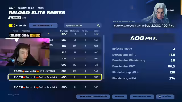 03:28:49Der Streamer erläutert im Detail die Regeln des 'DUO VICTORY CUP'. Jedes Duo kann in einer Stunde maximal drei Runden spielen, von denen jede ein separates Spiel ist. Das siegreiche Duo pro Runde erhält 200 Dollar. Anschließend wird die turnierliche Landschaft der kommenden Woche kritisch betrachtet. Er ist unzufrieden mit dem neuen Qualifikationssystem für den Reload Cup, das nur Top 20 statt Top 400 qualifiziert, und sieht für die kommende Woche kaum spielwürdige Turniere.