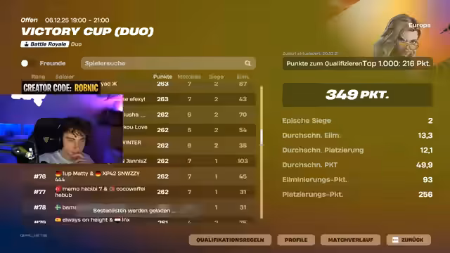 01:20:00Das Duo überprüft ihr aktuelles Ranking im Cup und bespricht die notwendigen Punkte für eine gute Platzierung. Sie erwähnen, dass sie aktuell in den Top 260 sind, aber noch weitere Spiele benötigen, um ihr Ziel zu erreichen. Dabei analysieren sie die Schwierigkeit der Lobbys und die Notwendigkeit, in den nächsten Runden konstant Punkte zu sammeln.