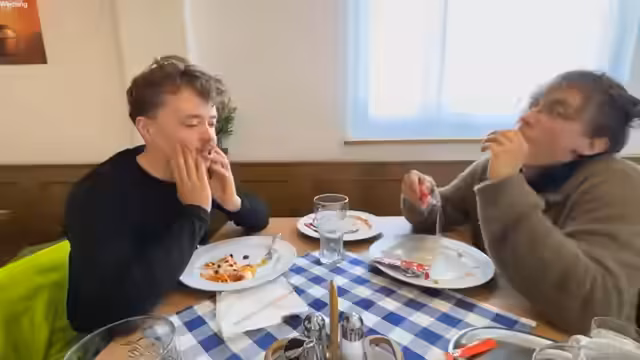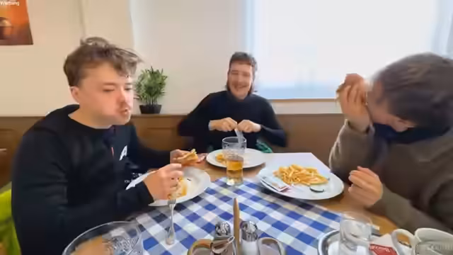 04:05:46Die Streamer bestellen in einer Hütte ein Mittagessen. Ein Streamer entscheidet sich für einen Veggie-Burger mit Pommes und Salat, während andere verschiedene Optionen wie Kaiserschmarrn oder Apfelstrudel in Betracht ziehen. Dabei diskutieren sie über ihre kulinarischen Vorlieben und Abneigungen - insbesondere bei Zwiebeln und Tomaten. Die Bestellung dauert etwas länger, da die Streamer ihre Wünsche präzisieren müssen.