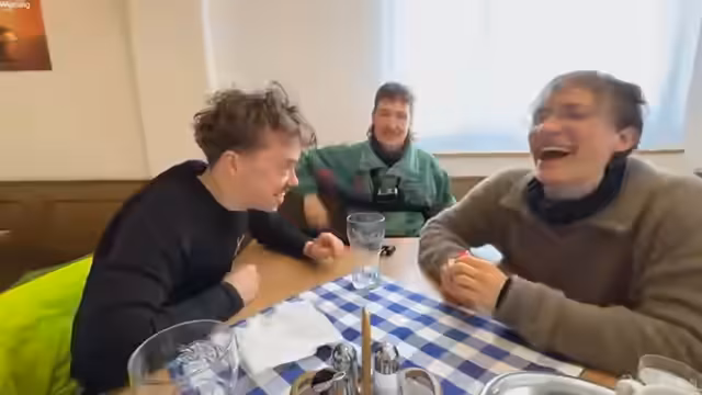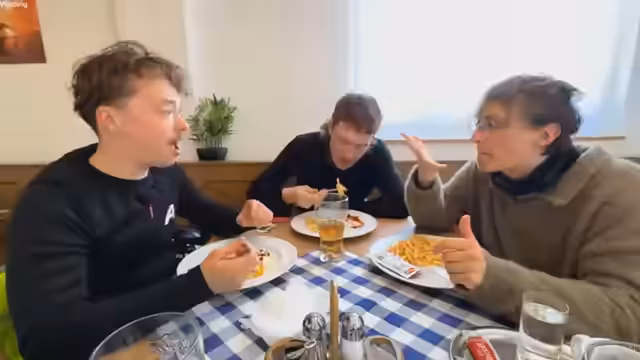 03:16:16Es wurde die Verantwortung gegenüber dem minderjährigen Jonsmann thematisiert, der mit einer Einverständniserklärung der Eltern unterwegs war. Anschließend wurde über das bevorstehende Mittagstief und mögliche Strategien dagegen gesprochen, wie zum Beispiel weniger zu essen. Im Gespräch ging es um die Essensauswahl und die Vorfreude auf die Mahlzeit. Jonas wurde vorgeschlagen, sich im Restaurant zu entspannen und etwas zu trinken zu bestellen, während die anderen noch eine Abfahrt machen. Es wurde über die Schwierigkeiten bei der Abfahrt gesprochen, insbesondere über die Rillen im Schnee, die zu Stürzen führten. Trotzdem erreichten sie das Restaurant, wo sie sich nach einem Tisch umsahen und über die Speisekarte diskutierten.