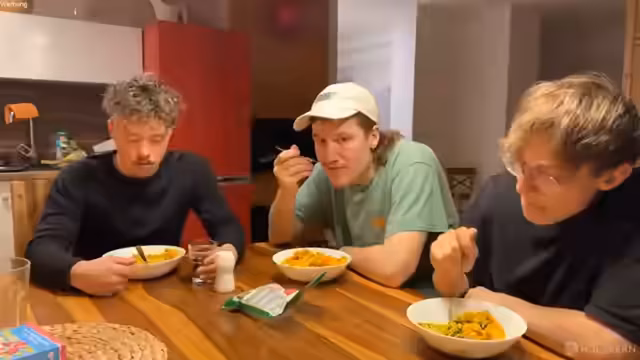 10:09:07Es beginnt mit einer Diskussion über Reis, wobei Ronny vorgibt, keinen Reis zu mögen, was sich als Prank herausstellt. Es wird über die richtige Menge Reis pro Person und die Zubereitung gesprochen. Der Besuch im Spa wird kurz erwähnt, ebenso wie der schnelle Reifeprozess einer Banane. Anschließend wird über die Zubereitung von Reis mit Kokosmilch diskutiert, wobei verschiedene Meinungen und Tipps ausgetauscht werden. Es wird überlegt, ob man das Gemüse bereits beim Reiskochen hinzufügen soll. Es wird über einen Clip vom Eisbaden gesprochen, den sich die Gruppe ansehen möchte. Es wird überlegt, ob man alles in einem Topf kochen soll. Die Gruppe diskutiert über die Reihenfolge der Zutaten und die richtige Menge an Flüssigkeit. Es wird überlegt, ob man Zwiebeln schneiden soll, obwohl kein passender Topf vorhanden ist. Es wird über die Röstaromen von Gemüse und die Vorteile des Dünstens gesprochen. Es wird über ein Lied gerätselt, das jemand schnipst, und es werden verschiedene Kinderserien und -lieder ausgetauscht. Abschließend wird über die Konsistenz des Reises diskutiert und ob er noch etwas länger im Wasser bleiben sollte. Dieser Abschnitt ist geprägt von kulinarischen Experimenten, humorvollen Missverständnissen und dem Austausch von Kindheitserinnerungen.