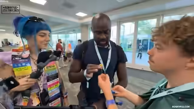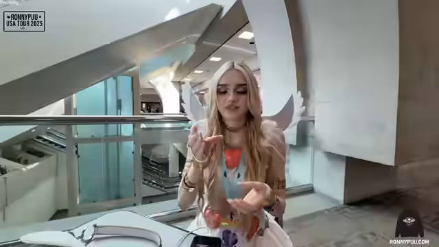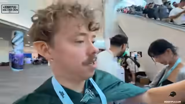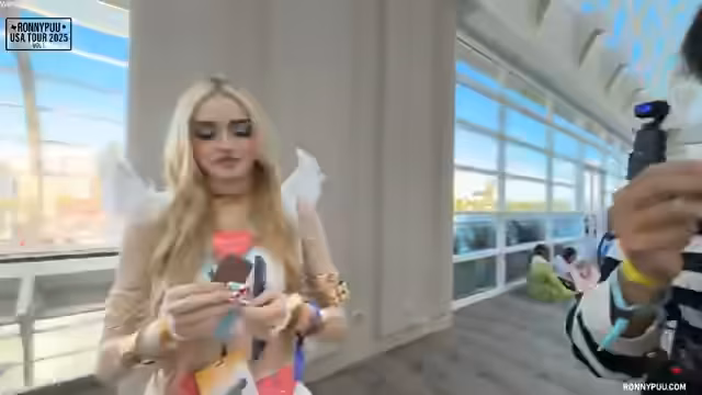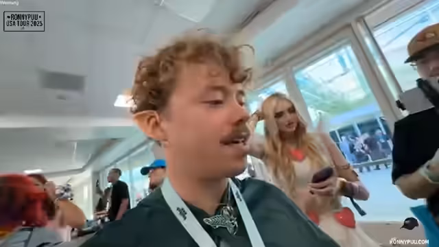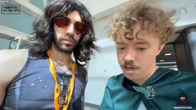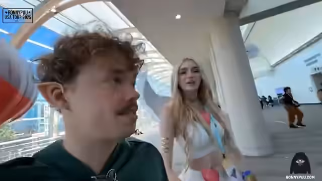 01:43:59Die Gruppe erreicht das Convention Center und steht vor der Aufgabe, die Badges abzuholen. Es wird darauf hingewiesen, dass während des Badge-Pick-ups nicht gestreamt werden darf, weshalb die Kamera kurz ausgeschaltet wird. Die Prozedur wird als schnell eingeschätzt, etwa zwei Minuten. Es wird über mögliche Internetprobleme auf der Messe gesprochen, da ein Bekannter berichtete, dass das WLAN auf der Messe kostenpflichtig sei und man für 70 Dollar Internet kaufen müsse, da es sonst kein Netz gäbe. Die Gruppe ist gespannt, ob sich dies bewahrheitet. Währenddessen wird ein Give-Away für ein iPhone 16 Pro Max ausgelost, und der Gewinner wird im Chat bekannt gegeben. Es kommt zu weiteren Diskussionen über Isas Kostüm, das als „Panties“ aus dem Anime „Panties and Stockings“ identifiziert wird, und als „Horny Angel“ beschrieben wird. Die Suche nach dem Badge-Pickup-Bereich gestaltet sich etwas schwierig, da die Beschilderung unklar ist. Es wird über die Möglichkeit gesprochen, die Partner Lounge zu nutzen, um nicht benötigte Gegenstände zu verstauen und Becher für Snacks zu organisieren, bevor man sich unter die Leute mischt.