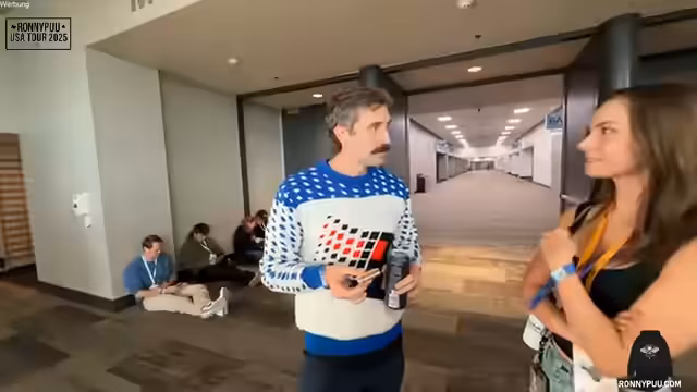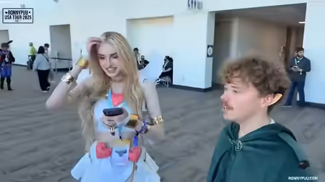 01:24:02Auf dem Weg zur TwitchCon wird bemerkt, dass der Router vergessen wurde, was das Lesen des Chats erschwert. Trotzdem wird beschlossen, den Router oben zu lassen, da er nicht unbedingt benötigt wird. Die Gruppe macht sich zu Fuß auf den Weg, wobei die Zimmerkarte bei Isa und der Schminkfrau ist. Es kommt zu einer ersten Begegnung mit einem LOL eSports Pullover-Träger, der als „einer von uns“ identifiziert wird. Die Diskussion über den alten und möglicherweise unsicheren Aufzug im Hotel wird fortgesetzt, wobei Isa sich weigert, ihn zu benutzen. Der Fußweg zum Convention Center wird als relativ kurz und angenehm empfunden, da das Wetter nicht zu heiß ist. Es wird über Isas beeindruckendes Kostüm gesprochen und die Notwendigkeit von Fotos für den Chat betont, auch wenn Isa sich weigert, für weitere Aufnahmen ins Zimmer zurückzukehren. Die Gruppe erreicht schließlich das Convention Center, wo die Badges abgeholt werden müssen, wobei das Streamen während des Abholvorgangs untersagt ist.