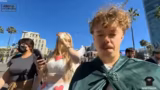 02:42:40Der Streamer versucht, amerikanischen Besuchern deutsche Snacks zu einem Produkttest zu überreden. Besonders der Joghurette, eine Art gefüllte Schokolade, kommt gut an. Es werden auch Kinder-Produkte wie Duplo und Kinder Schoko-Bons getestet und bewertet. Währenddessen finden mehrere kurze Interviews mit Convention-Besuchern statt, die über ihr Cosplay und ihre Social-Media-Kanäle sprechen. Das Geschehen wird durch den Versuch unterbrochen, eine bestimmte Person zu finden oder zu treffen.