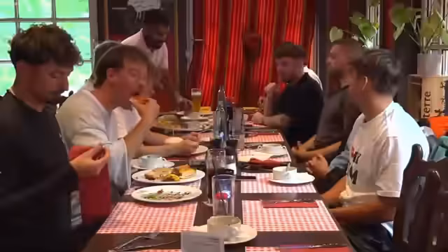 05:03:16Nach der Ankunft am Restaurant folgt eine längere Essenspause. Die Gruppe bestellt verschiedene Gerichte, darunter Steaks und Burger. Während des Essens kommt es zu lustigen Anekdoten und Interaktionen, die die Stimmung auflockern. Parallel wird die Zeit genutzt, um die letzten Vorbereitungen für die verbleibende Strecke zu treffen. Die Handys der Teilnehmer, insbesondere das von Kuba, werden geladen und auf Funktion geprüft, da sie während der Tour wichtig für die Kommunikation sind.