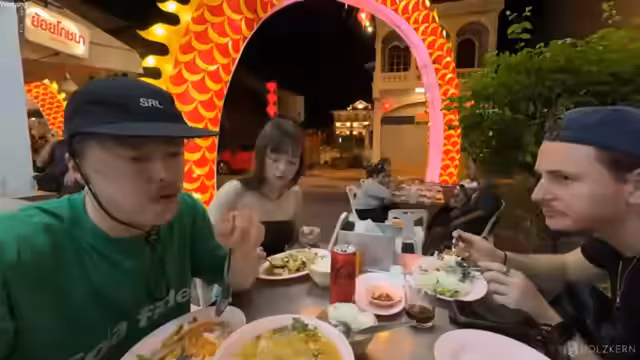 01:04:11Die Gruppe verkostet verschiedene Getränke, darunter Wasser und Fanta, und diskutiert deren Geschmacksunterschiede im Vergleich zu Deutschland und anderen Ländern. Besonders die Fanta wird als andersartig wahrgenommen, ähnlich der italienischen oder niederländischen Variante. Es wird auch über die Süße von Cola diskutiert und die unterschiedliche Farbgebung von Orangenlimonade in den USA im Vergleich zu Deutschland. Ronny äußert seine Begeisterung für das Wasser und probiert verschiedene Getränke, während Meli eine Sprite-Challenge bevorsteht, bei der sie versuchen soll, nicht zu rülpsen. Es wird über die thailändische Schärfe im Essen gesprochen und die Bedeutung von Chili-Stückchen für den Schärfegrad. Ronny genießt sein Essen und lobt den süß-sauren Geschmack, während er überlegt, noch Schärfe hinzuzufügen. Er erinnert sich an frühere Rubbellos-Aktionen und Gewinne in Kiosken. Die Gruppe bestellt weitere Getränke und isst verschiedene Gerichte, darunter Tofu-Suppe und Spicy Salat, wobei die Schärfe des Salats diskutiert wird. Es wird auch über vegetarische Optionen in Thailand gesprochen, wobei festgestellt wird, dass es nicht immer einfach ist, vegetarische Gerichte zu finden, aber dennoch möglich ist. Die Gruppe genießt das Essen und die Atmosphäre in Phuket.