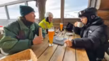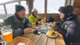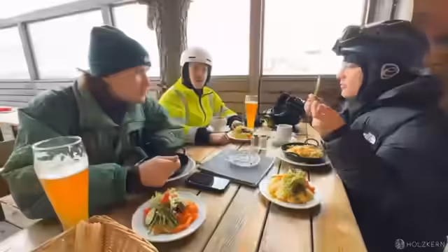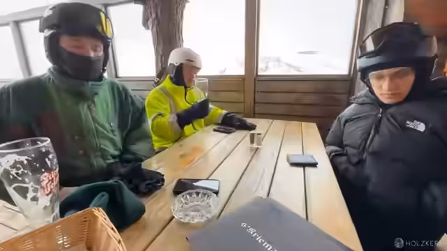 03:27:05Auf den Pisten begegnen sie Touren-Skiläufern, die aus Umweltschutzgründen nicht den Lift nutzen. Dies führt zu einer Erklärung des Tourenskis, das eine Mischung aus Skilanglauf und Abfahrt ist. Während der Pause in einer Hütte, die durch einen starken Wind ungemütlich ist, werden sie von einem englischsprachigen Snowboarder angesprochen. Der Streamer nutzt die Gelegenheit, seinem Publikum das Pistenrestaurant vorzustellen.
