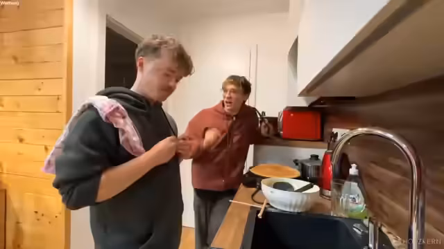 08:16:44Der Fokus verlagert sich auf das Kochen. Die Streamer entscheiden, Palatschinken zu machen und diskutieren über die genaue Bezeichnung und die Zubereitung. Sie suchen nach einem Rezept, den passenden Küchengeräten wie einer Schüssel und einer Pfanne. Dabei gibt es auch kleine Streitereien über die Konsistenz des Teigs und die richtigen Zutaten, wie die richtige Menge an Mehl und Eiern.