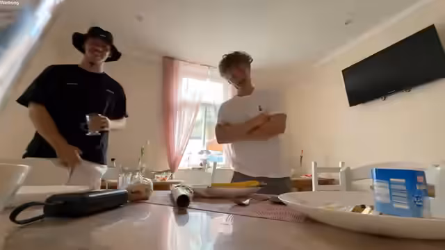 02:07:09Während des Frühstücks wird die Unterhaltung fortgesetzt, mit Fokus auf Film- und Serientipps. Ronny spricht über seine Vorliebe für Geschichten, egal wie alt sie sind, und erwähnt, dass ihm die Charakterentwicklung in Filmen wichtig ist. Die Gruppe diskutiert über verschiedene Genres und empfiehlt gegenseitig Titel. Eine versteckte Kamera im Badezimmer sorgt für zusätzliche Komik und Überraschungsmomente.