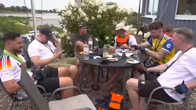 05:38:58Die Gruppe macht eine längere Mittagspause an einer Anlegestelle und isst diverse Wurstsorten wie Krakauer und Bratwurst. Während der Pause gibt es humorvolle Auseinandersetzungen über Platzverteilung und Komfort. Nebenbei sprechen die Streamer über persönliche Themen, einschließlich eines Spotts über jemanden, der angeblich nicht schwimmen kann, was zu einer längeren Diskussion über öffentliche Wahrnehmung und private Realität führt. Sie unterhalten sich auch über ihre Ernährungsgewohnheiten und Gesundheitsthemen.