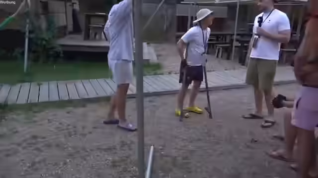 13:29:45Die Gruppe beschließt, mit Stelzen ein Rennen zu veranstalten, was zu weiteren lustigen Momenten führt. Die Teilnehmer unterstützen sich gegenseitig und konzentrieren sich darauf, die Herausforderung meistern, ohne sich zu verletzen. Die Stimmung ist heiter und zeigt den Teamgeist der Gruppe.