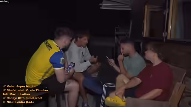 15:52:39Ein besonders kniffliger Charakter wird von den Spielern ermittelt - es handelt sich um Martin Luther, was durch Fragen zur historischen Epoche und zur politischen Bedeutung eingegrenzt wird. Nach Abschluss des Spiels unterhalten sich die Streamer über ihre Erlebnisse der Nacht, diskutieren über die Schlafmöglichkeiten und teilen ihre persönlichen Highlights des Tages. Ronny berichtet über einen Ankauf eines Luftgewehrs für zukünftige Streams und die Gruppe bereitet sich auf den nächsten Tag vor, mit geplanten Raids zu anderen Streamern.