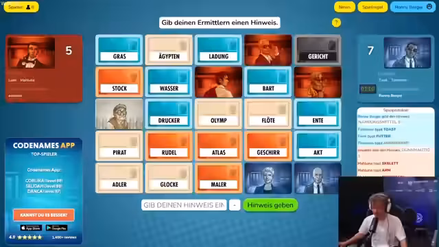05:54:06Die Gruppe wechselt das Spiel und startet eine Runde Codenames, einem Wortassoziationspiel. Es bildet sich ein Wettbewerb zwischen 'Girls vs. Boys'. Der Streamer übernimmt die Rolle des Geheimdienstchefs für sein Team und muss Wörter durch Hinweise erraten lassen, während das gegnerische Team versucht, die Begriffe zu 'entdecken'. Das Spiel ist von hoher Konzentration und strategischem Denken geprägt.