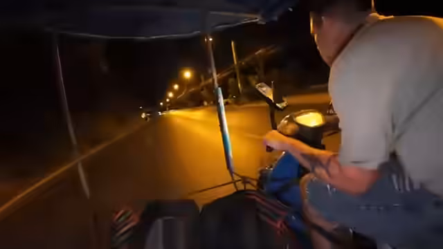 03:14:36Die Gruppe bietet 'Freerides' nach Chawang Beach an, wobei sie Passanten ansprechen, jedoch ohne Erfolg. Ein Hund scheint ebenfalls an einer Mitfahrgelegenheit interessiert zu sein. Ronny äußert Bedenken bezüglich der Verkehrssicherheit. Sie versuchen weiterhin, Leute für eine kostenlose Fahrt zu gewinnen, stoßen jedoch auf Ablehnung. Es wird festgestellt, dass es sich um eine Einbahnstraße handelt, was die Situation zusätzlich erschwert. Die Gruppe spekuliert, dass die wenigen Leute, die unterwegs sind, möglicherweise auf dem Weg zur Fullmoon-Party sind. Es wird überlegt, Xenon-Scheinwerfer am Motorrad anzubringen, aber die Kosten dafür sind zu hoch. Trotz der Herausforderungen setzen sie ihre Freeride-Aktion fort und versuchen, Passanten auf Englisch und Deutsch anzusprechen, wobei sie betonen, dass die Fahrt kostenlos ist.